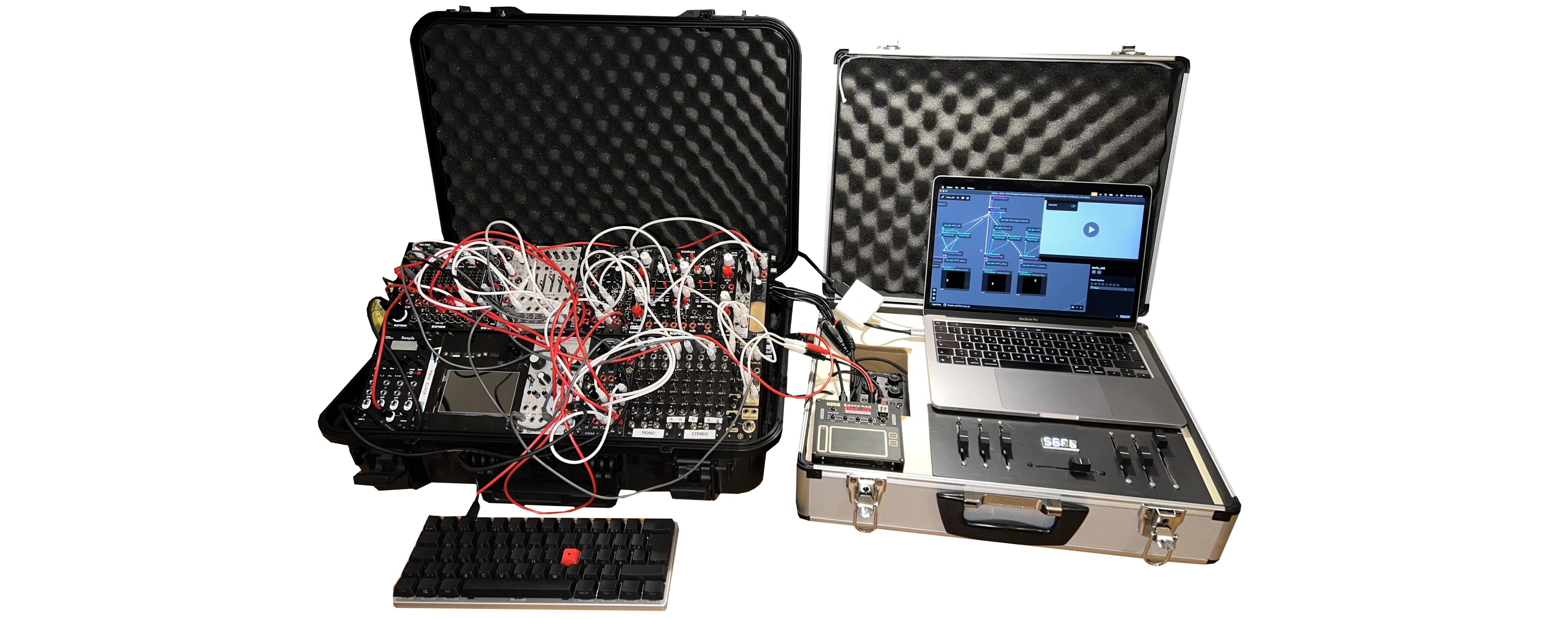 I need a minimum of 130 cm x 80 cm space (the best is 150 cm x 100 cm for some room). If possible, I prefer a setup where people can walk around me and take a look at the machines in action. I require good access to the two cases I bring and place a small keyboard in front of them. I usually play standing and expect a regular DJ desk, but if the venue is a chill place, I can also play sitting down on the floor. I require only a small bit of light on my setup and bring my own battery-powered LEDs in case stage light is not available or otherwise. I use modular Eurorack synthesizers but convert everything down to line-level signals for punch-in effects and FFT analysis to sync my visuals.